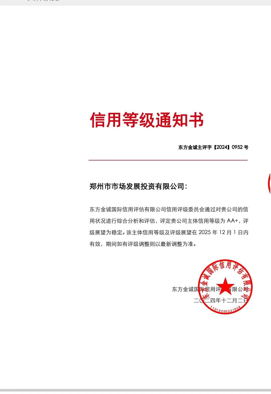 鄭州市市場發展投資有限公司再獲AA+主體信用評級