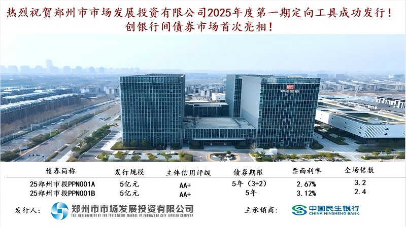 近日,鄭州市市場發展投資有限公司(以下簡稱“鄭州市投”,外部主體評級AA+)成功發行2025年度第一期定向債務融資工具,進一步優化了公司融資結構。本期債券由民生銀行擔任主承銷商,發行總規模10億元,創新采用“3+2年”(票面利率2.67%)與“5年”(票面利率3.12%)雙期限結構,創下近期同期限、同評級企業信用債首發利率較低水平,顯示出資本市場對鄭州國企發展前景的高度認可。
