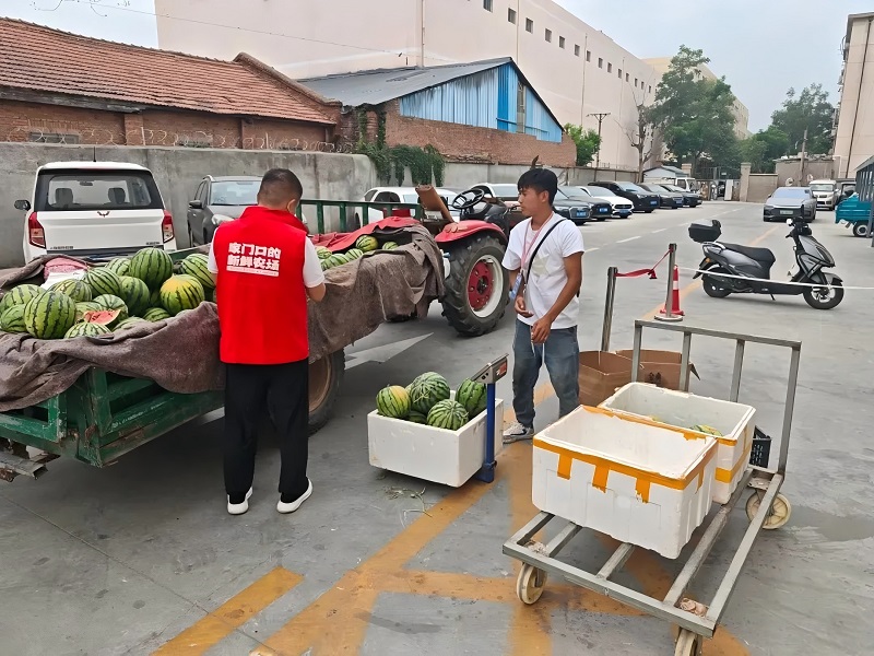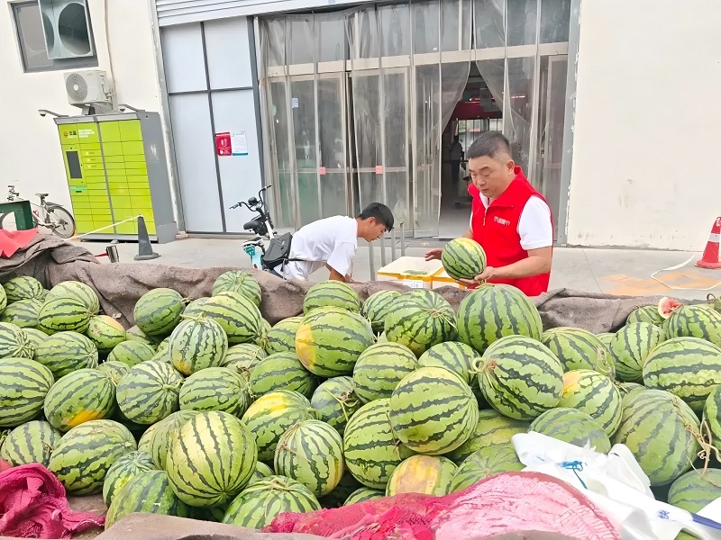 了解到這一情況后,市投集市未來路市場管理人員立即主動上前,與瓜農深入溝通,并迅速協調安排,將整車2000余斤西瓜轉運至市投集市未來路市場內避雨銷售。市場不僅免費提供惠農攤位,還通過線上線下渠道幫助推廣,號召市民朋友們愛心助農。